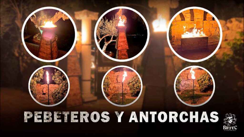 Sistema lanzallamas con 5 salidas de fuego independientes en forma de abanico. Puede producir los chorros de fuego en 4 colores (Natural, Rojo, Verde y Naranja). La llama alcanza una altura de 6m.